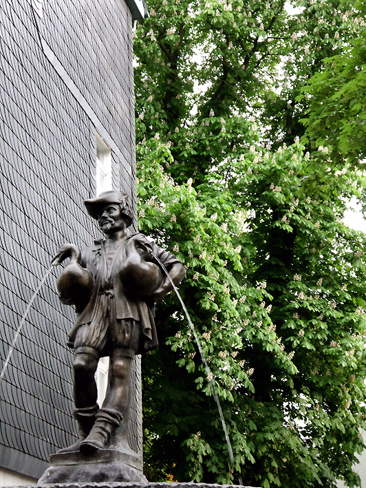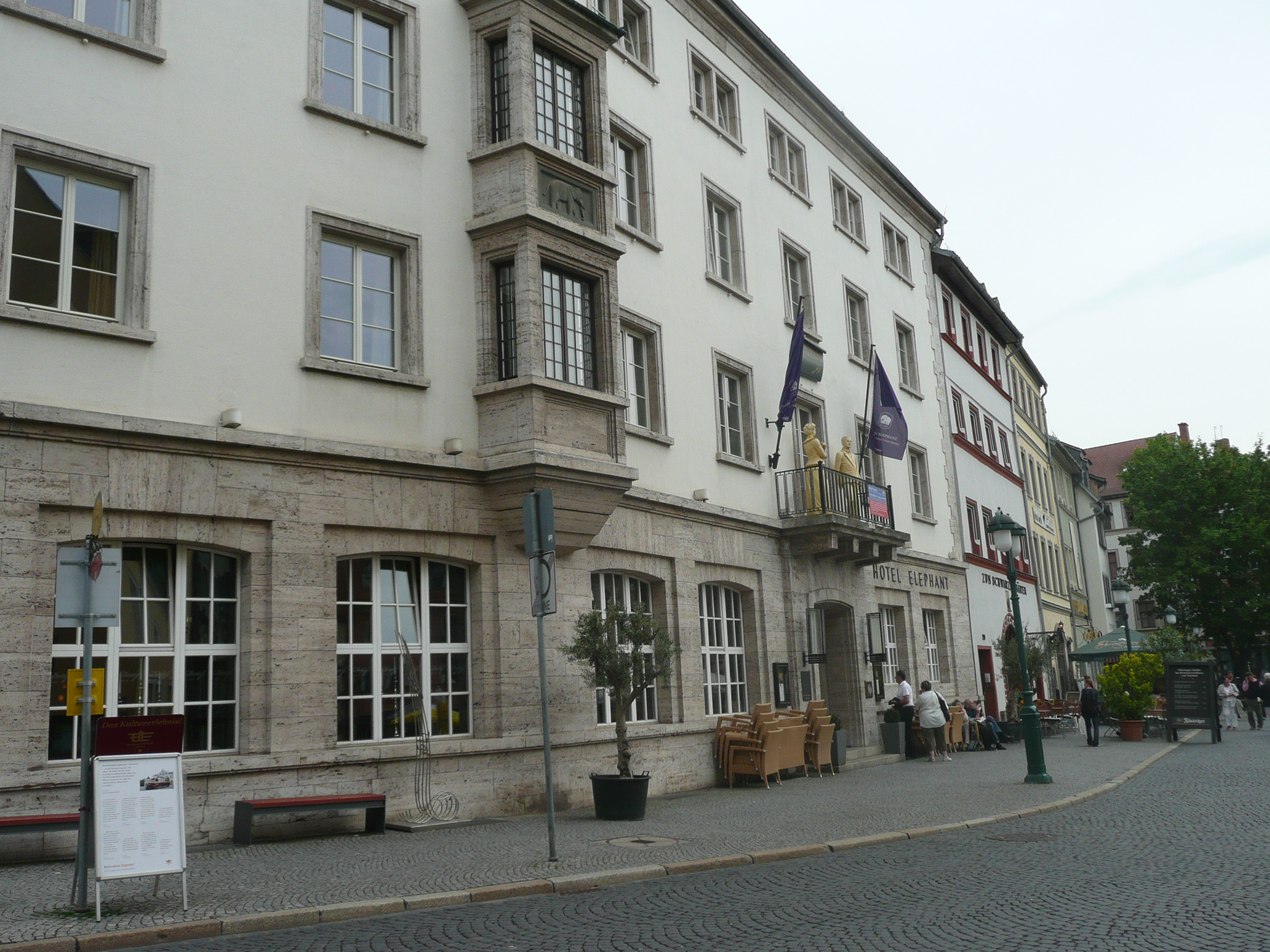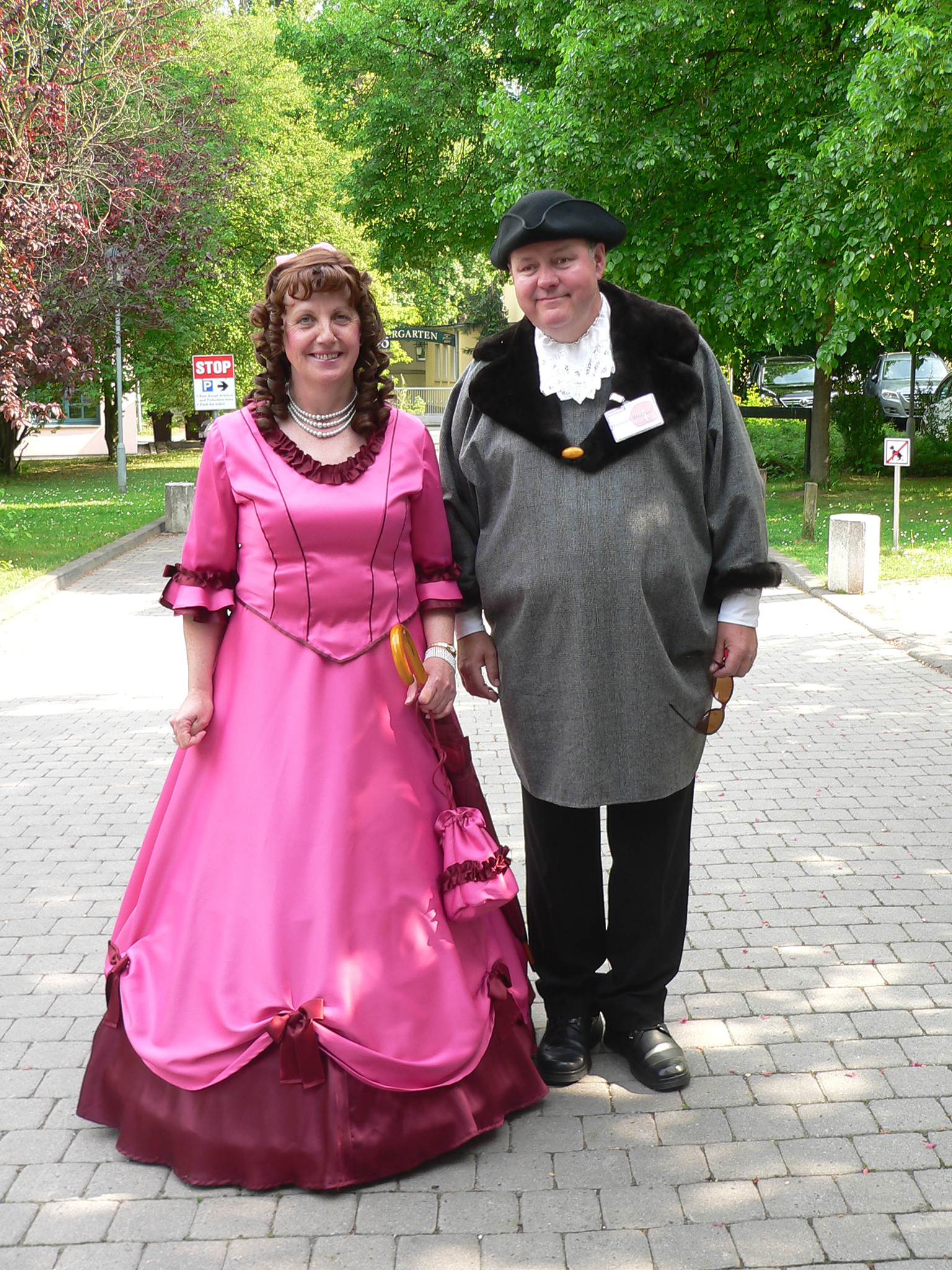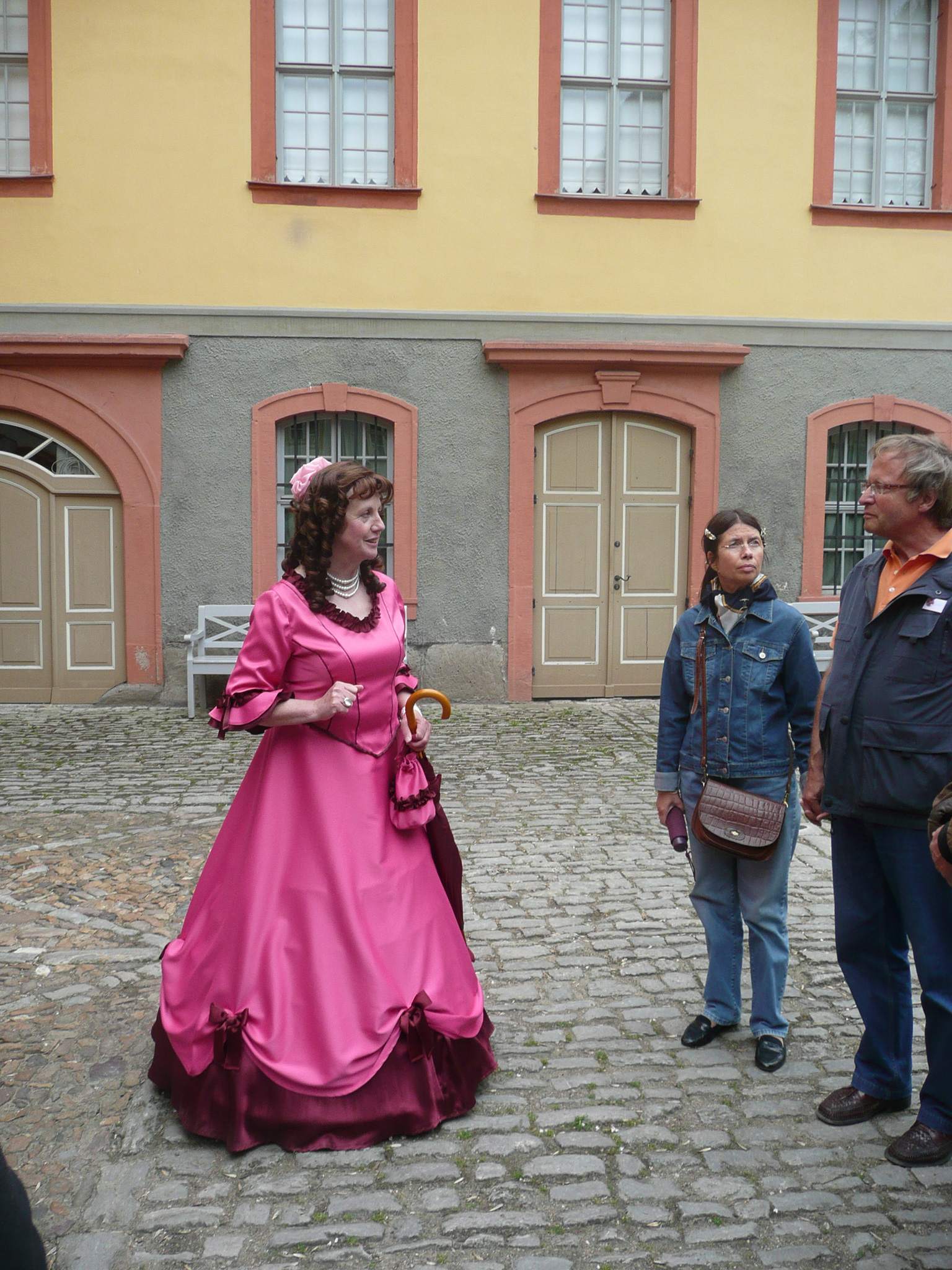 In historische Gewänder gehüllt, begrüßten uns eine Stadtführerin und ein Stadtführer. Im Nachhinein gesehen hatte die Teilnehmergruppe um die Stadtführerin das bessere Los gezogen. In die Rolle der Person der Herzogin Anna Amalia geschlüpft, zog uns die Führerin mit ihren vielenpersönlich und in der „Ich”-Form gehaltenen Berichten um die Ereignisse der Zeit rund um Goethe, Schiller, Liszt, Wieland und wie sie Alle noch hießen, in den Bann. Manch’ schlüpfrige Anekdote über das höfische Leben und leidenschaftliche Aufopferung für ihr Wirken für Weimar und Umgebung bliebenuns so neben den historisch vermittelten Gegebenheiten und Ereignissen dieser wohl herrlichen Zeit gut im Gedächtnis. Während wir der anderen bereitsfertigen Gruppe begegneten, wandelten wir noch durch das städtische Lebensumfeld der Dichter und Komponisten, ehe wir uns nach zwei Stunden herrlichem Programm besonders herzlich von ihr verabschiedeten.