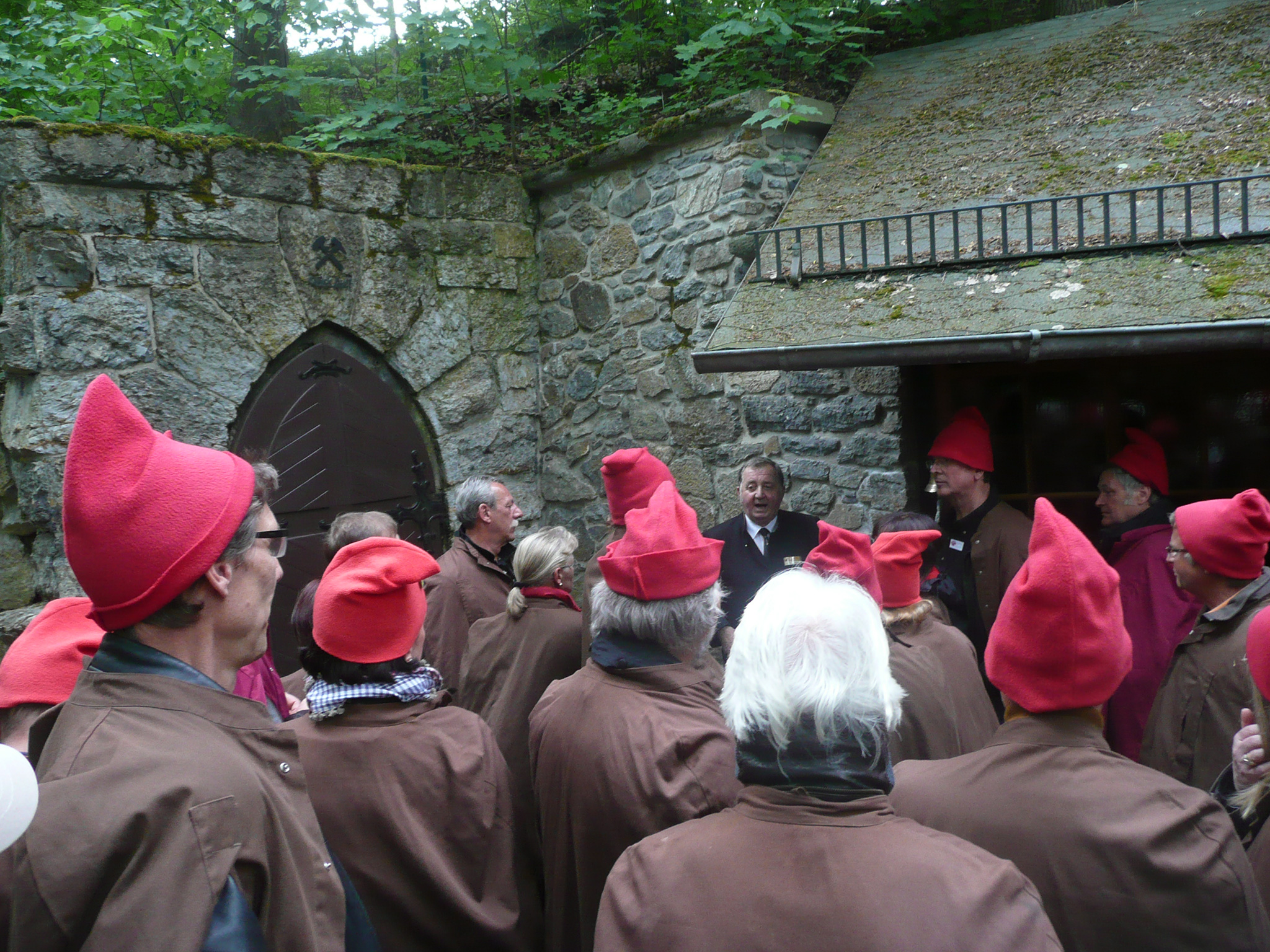 Dortwarteten bereits die „Saalfelder Feengrotten” auf unsere Erkundung. Geschwindverwandelte sich die Gruppe in eine Horde von zumeist rotbemützten und mit braunenUmhängen ausgestattete und lustig aussehende Zwergengruppe. Mit einem ihnen geheimen Trick verwandelten sich die eigentlich stattlich gewachsenen Carl-André und seine Freundin Franziska zur allgemeinen Gaudi in wahrhaftig kleinproportionierte Zwerggesellen, ehe es unter der sachkundigen Führung einesalten Bergmeisters (Obersteiger) in die Saalfelder Unter-, Stollen- und Höhlenwelt in den märchenhaften Lebensraum der Feen ging.